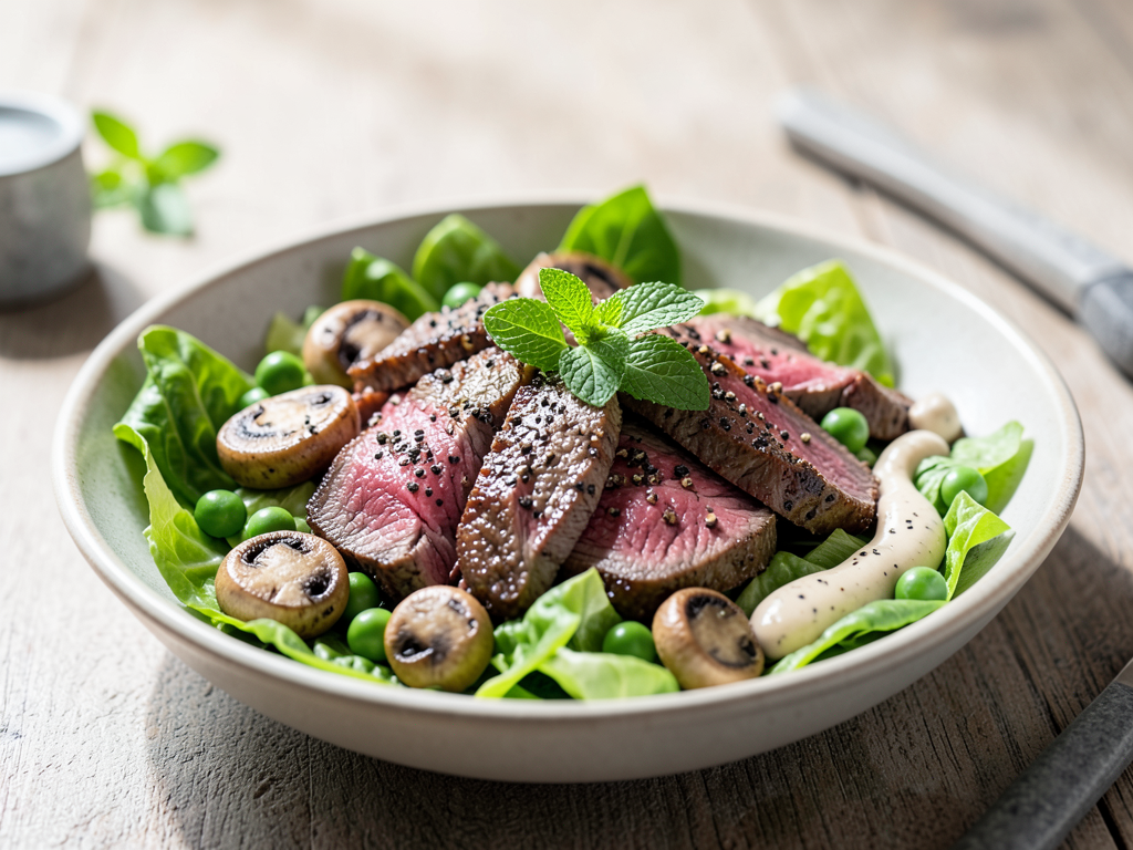 - In a large mixing bowl, combine the chopped romaine lettuce, cooked mushrooms, and peas. Toss gently to mix. Top with the sliced beef and sprinkle fresh mint leaves.