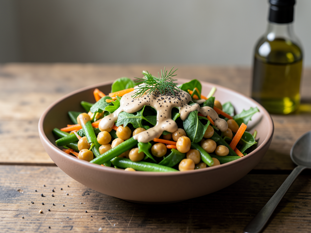 - Mix the Salad: In a large mixing bowl, combine the chickpeas, blanched green beans, shredded carrots, and mixed salad greens.