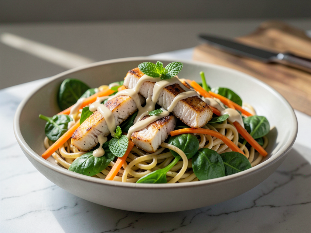 Get ready to impress your friends with this vibrant Black Pepper Cod Noodles Big Salad Bowl! This dish is a delightful medley of tender cod and perfectly cooked noodles, paired with the fresh crunch of spinach and carrots. With a burst of flavor from a drizzle of tahini and the aromatic touch of fresh mint, this salad bowl is not just a meal—it's an experience. Feel free to add your favorite veggies or switch up the noodles to create your perfect bowl!