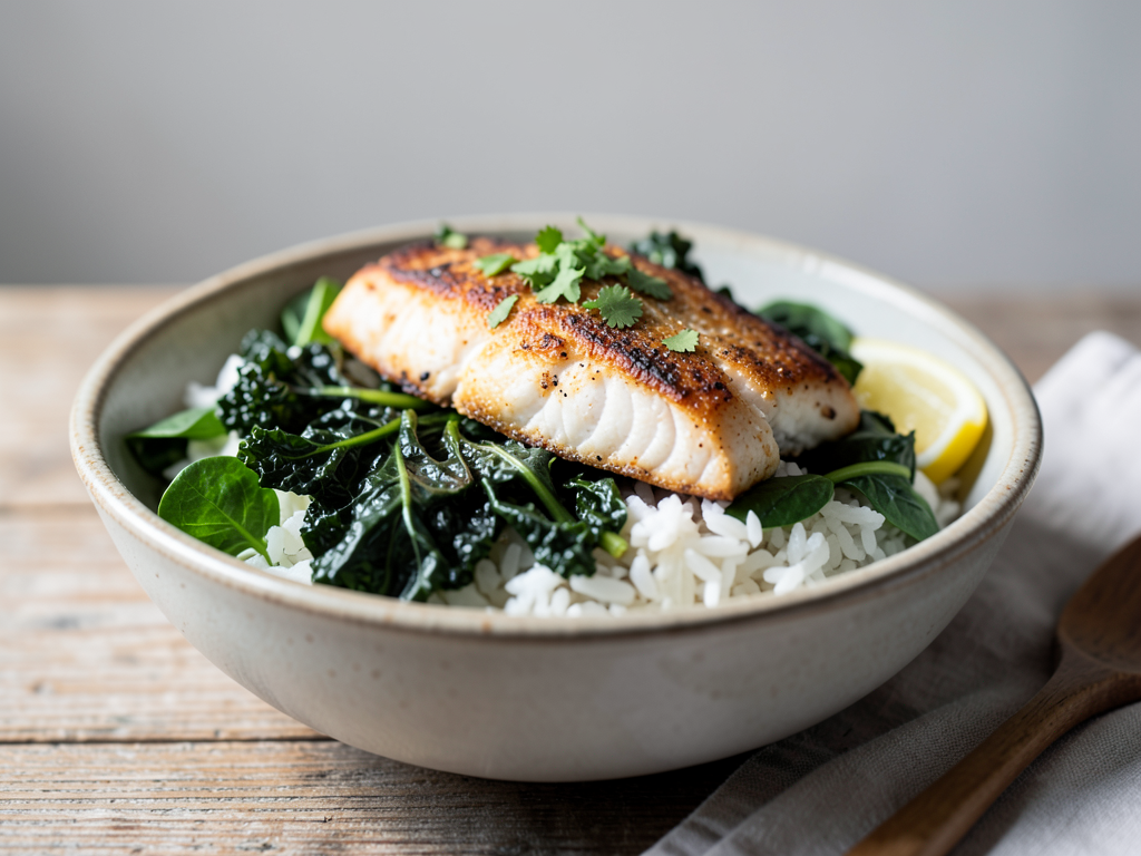 - Fluff the cooked rice with a fork and serve it as a base on plates. Top with the cod and greens mixture.