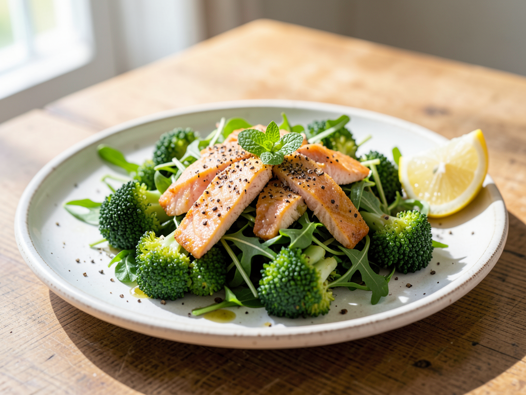 Black Pepper Salmon Salad with Broccoli and Arugula
