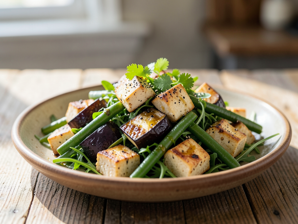Black Pepper Tofu Salad with Green Beans and Eggplant