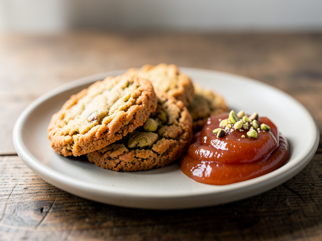 - Serve the cookies warm or at room temperature, topped with apple compote and a sprinkle of extra pistachios if desired.