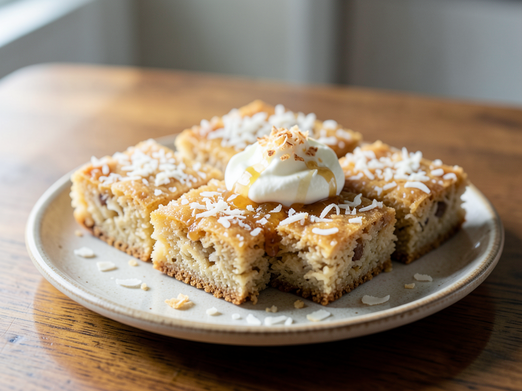 - Serve the blondies cut into squares, topped with a dollop of yogurt cream and a sprinkle of toasted coconut flakes if desired. Enjoy!
