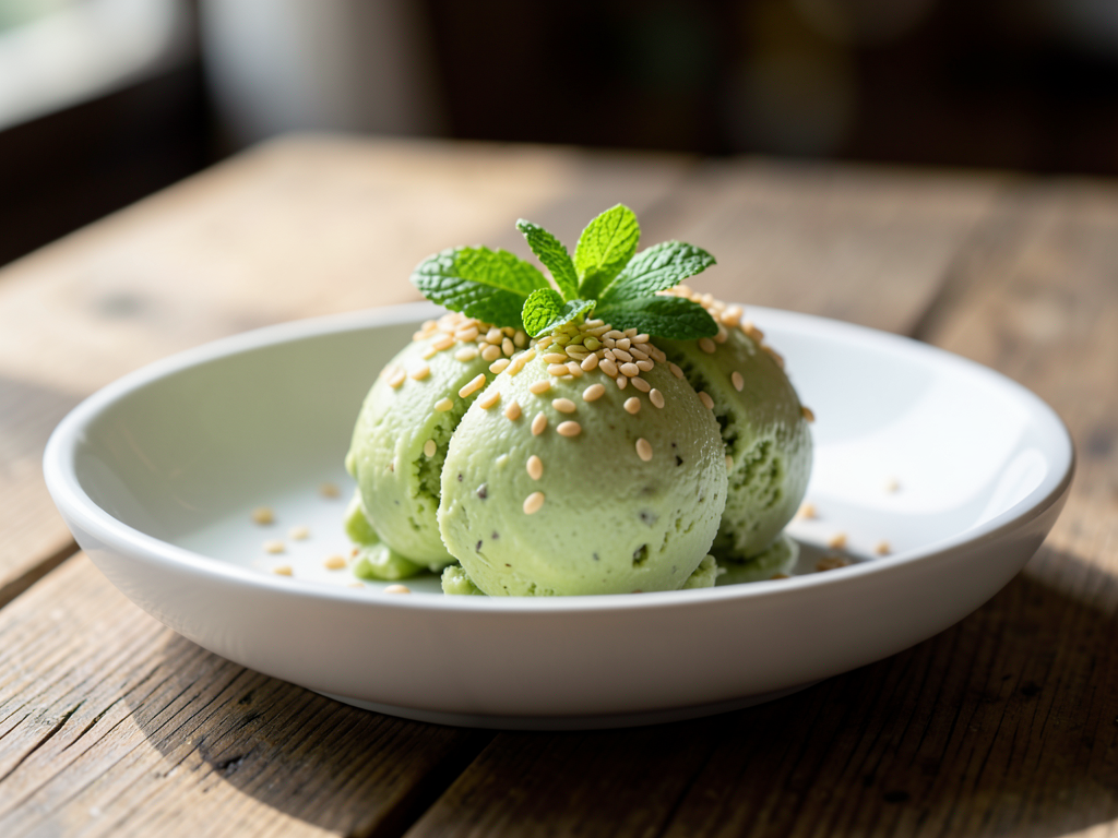 - Serve the sorbet in neat scoops, topped with toasted sesame seeds and fresh mint leaves as a simple garnish.