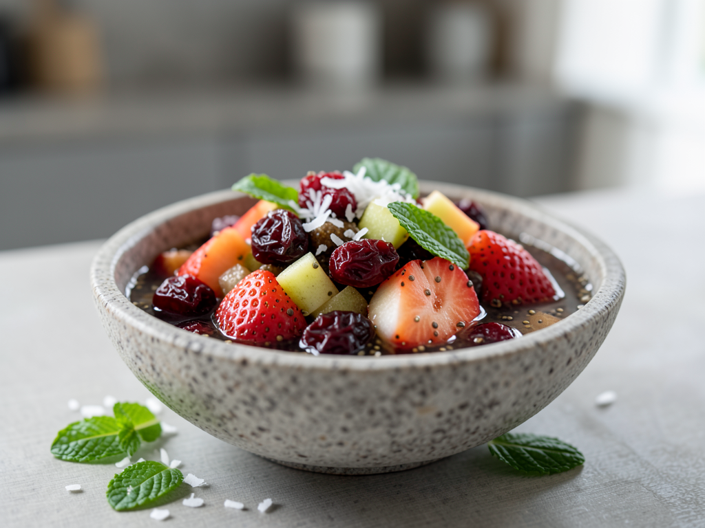- Spoon the fruit mixture into individual serving bowls, and garnish with fresh mint leaves or coconut flakes if desired. Enjoy your chilled fruit bowl!
