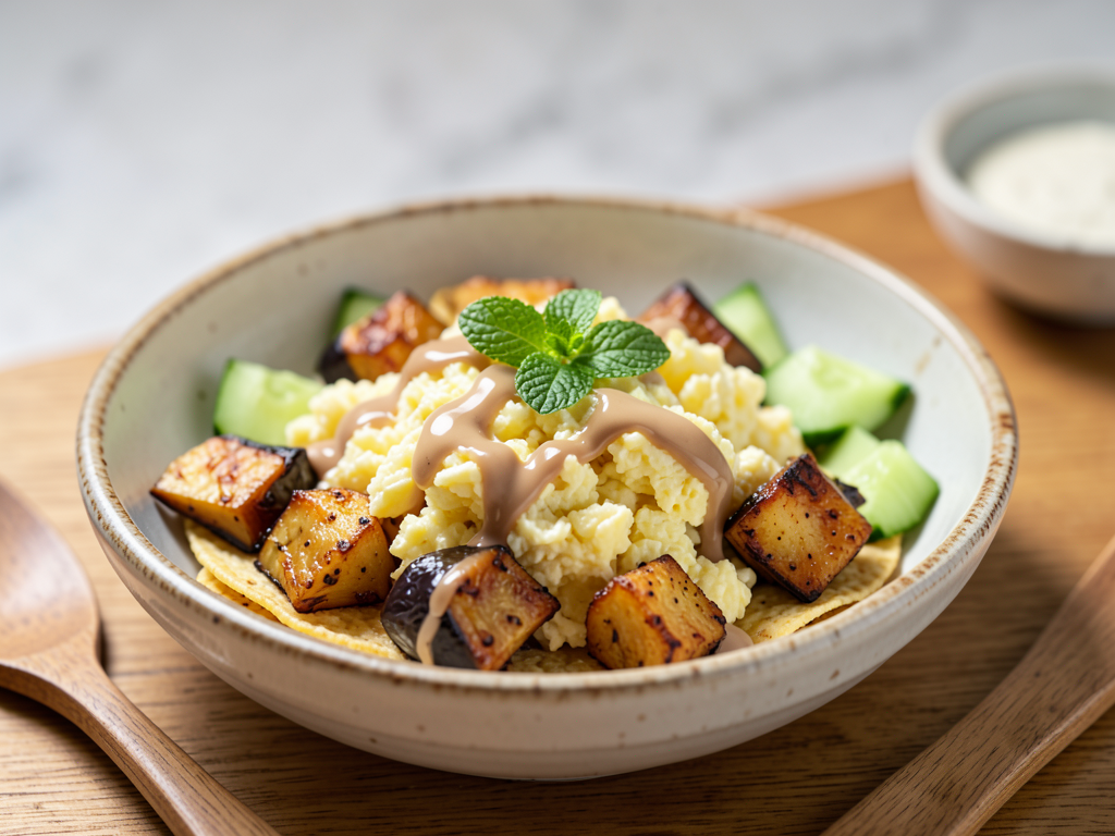 - To assemble the bowl, place two tortillas on each plate. Spoon the scrambled eggs into the center, add the roasted eggplant and diced cucumber around them.