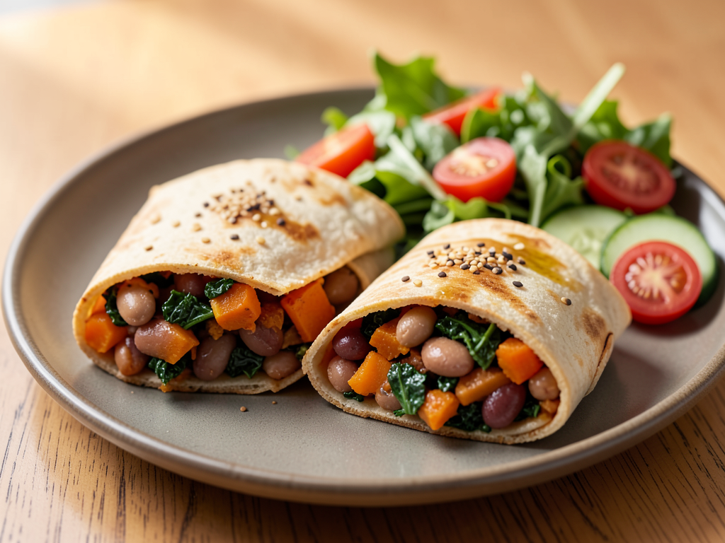 - Distribute the kidney bean filling evenly onto the wraps, fold them tightly, and cut in half to serve.