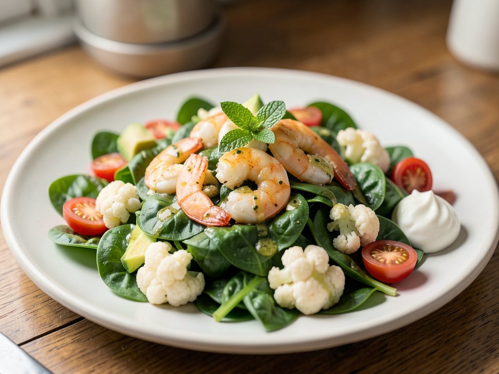 Cumin Lime Shrimp Salad with Spinach and Cauliflower
