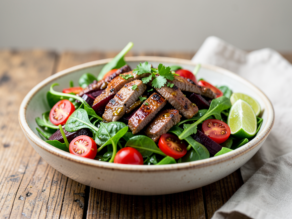 - Top the salad with the cooked beef strips, then garnish with fresh parsley and lime wedges on the side. Serve immediately.