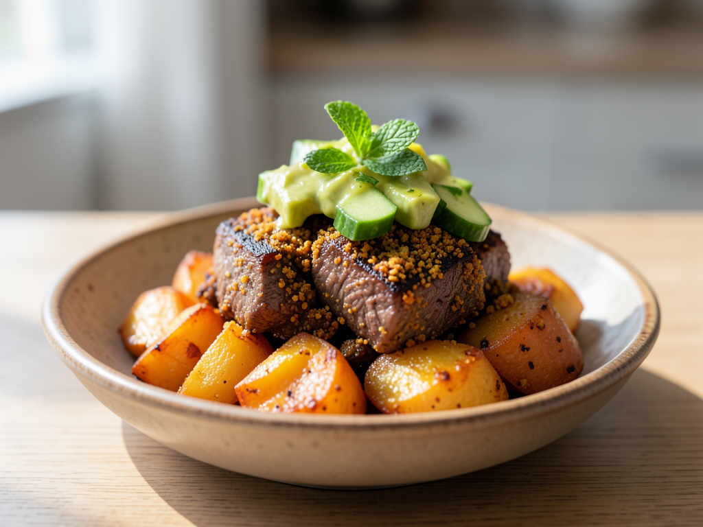 - To serve, plate a serving of sweet potatoes, top with the curry-spiced beef, and garnish with the avocado-cucumber mixture. Enjoy while warm!
