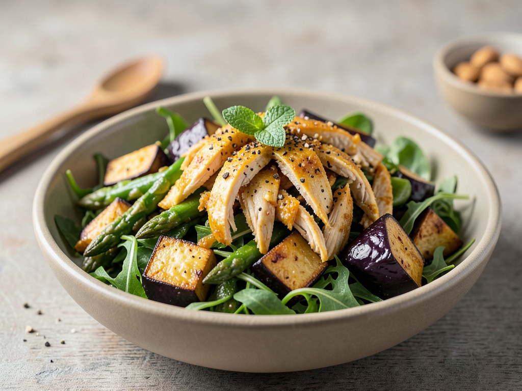 Curry Spice Chicken Salad with Eggplant and Asparagus