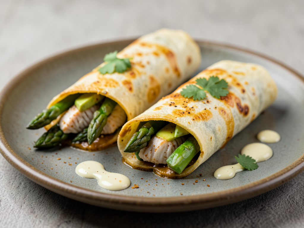 - Assemble the wraps by placing the cod and asparagus down the center, adding the sliced avocado on top.