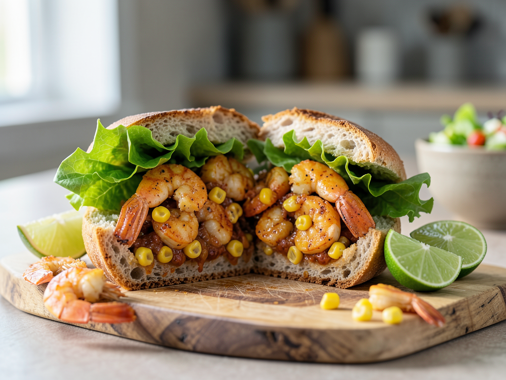 - Place a generous portion of the shrimp and corn mixture on two slices of bread. Top with chopped romaine lettuce, then close with the remaining slices of bread.