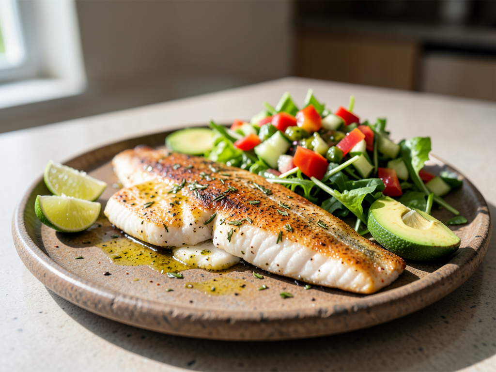 - While the fish is baking, prepare the fresh salad. In another mixing bowl, combine diced red bell pepper, cucumber, mixed greens, and chopped cilantro. Drizzle with olive oil and lime juice, then toss gently to combine.