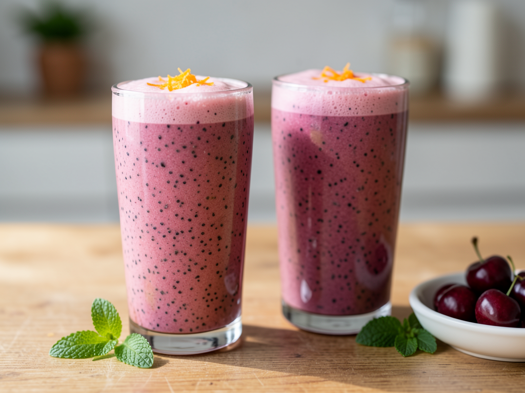 - Blend all ingredients on high until smooth, approximately 1-2 minutes, ensuring cherries and cranberries are fully puréed.