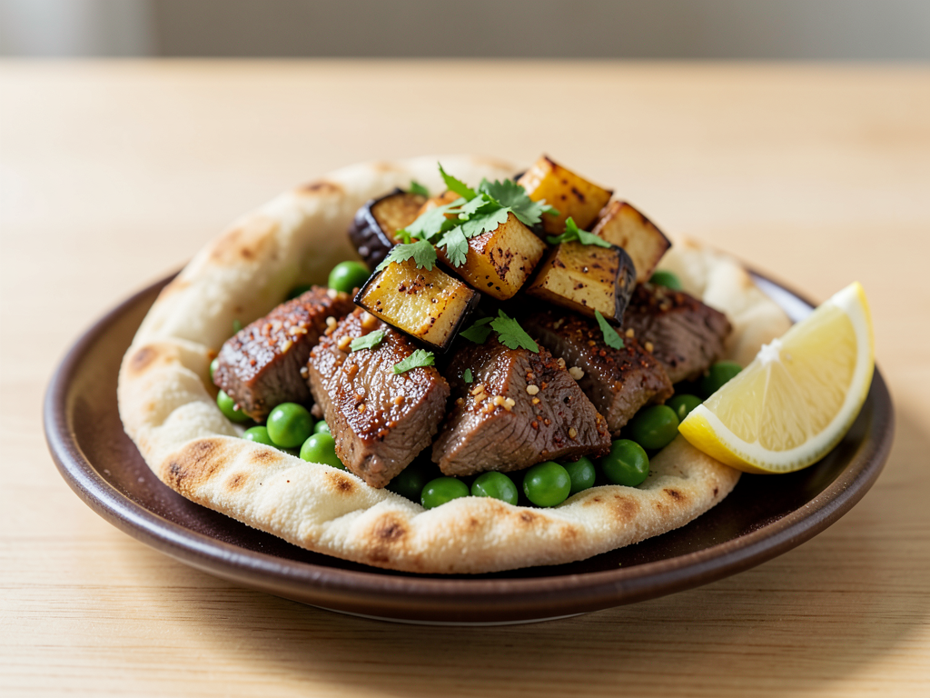 Get ready to indulge in a flavorful Garlic Paprika Beef Pita Bowl! This dish stars tender, seasoned beef paired with fresh, crispy peas and roasted eggplant, creating a vibrant mix of textures and colors. Topped with fresh cilantro and served with a zesty lemon wedge, this bowl is perfect for lunch or dinner. Feel free to switch up the toppings or add your favorite vegetables to make it your own!