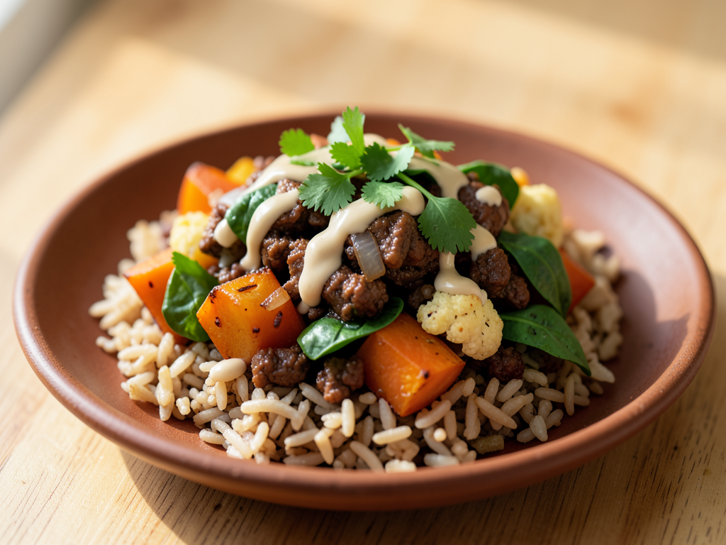 - To serve, spoon a portion of brown rice onto each plate, top with the beef and vegetable mixture, and finish with a drizzle of tahini and a sprinkle of fresh cilantro. Optionally, serve with lemon wedges and chili flakes for added flavor.
