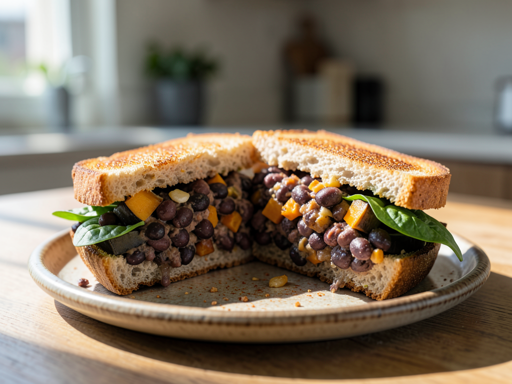 5. Assemble the sandwich: Place the black bean mixture on two slices of toasted bread, top with fresh spinach if desired, and cover with the other slices.