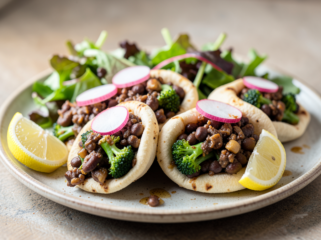 - Carefully open each pita and fill it generously with the black bean and broccoli mixture. Top with sliced radishes.