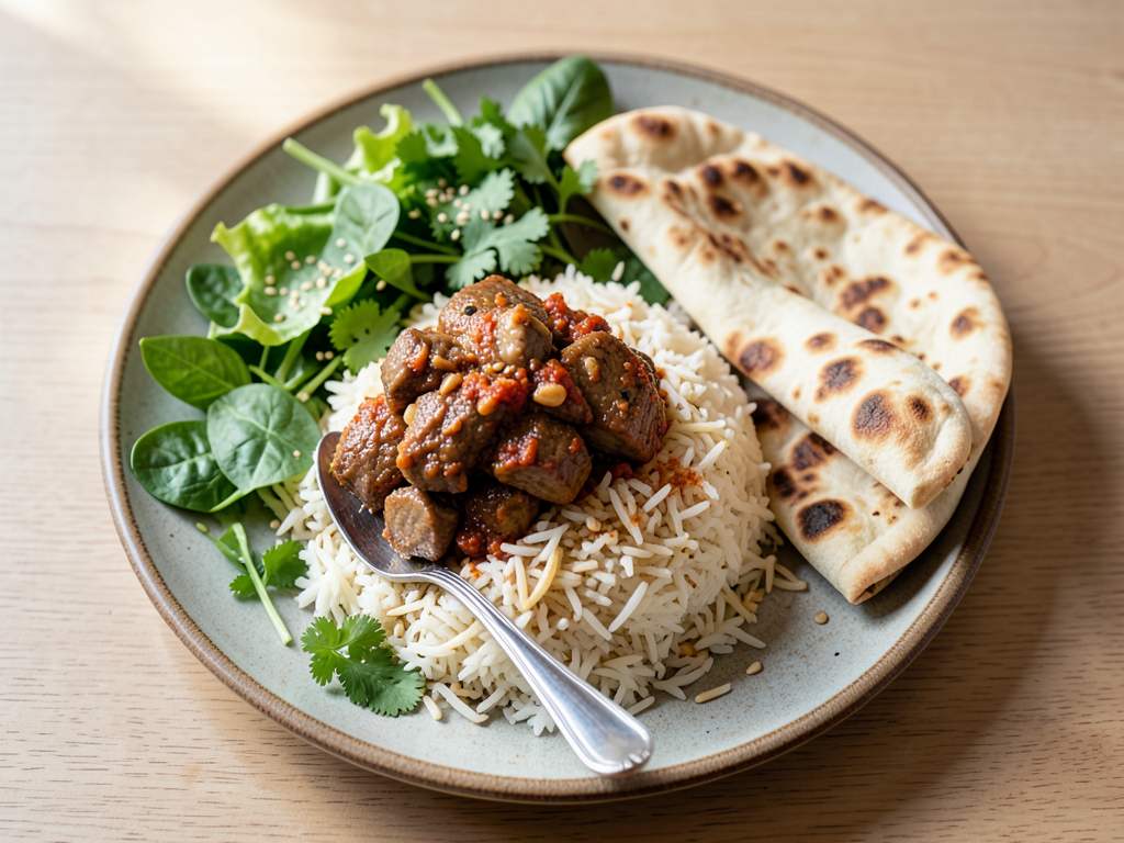 - To assemble, place a portion of rice on each serving plate, add a generous spoonful of the lamb mixture, a handful of chopped lettuce and spinach, and a sprinkle of cilantro and sesame seeds. Serve with warm pita on the side.