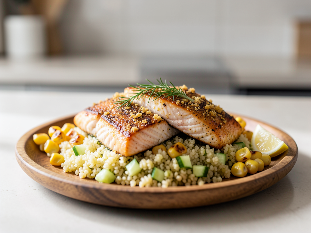- To plate, place a serving of couscous in the center of each plate, top with the garlic paprika salmon, and add corn around it. Garnish with fresh dill and serve with lemon wedges if desired.