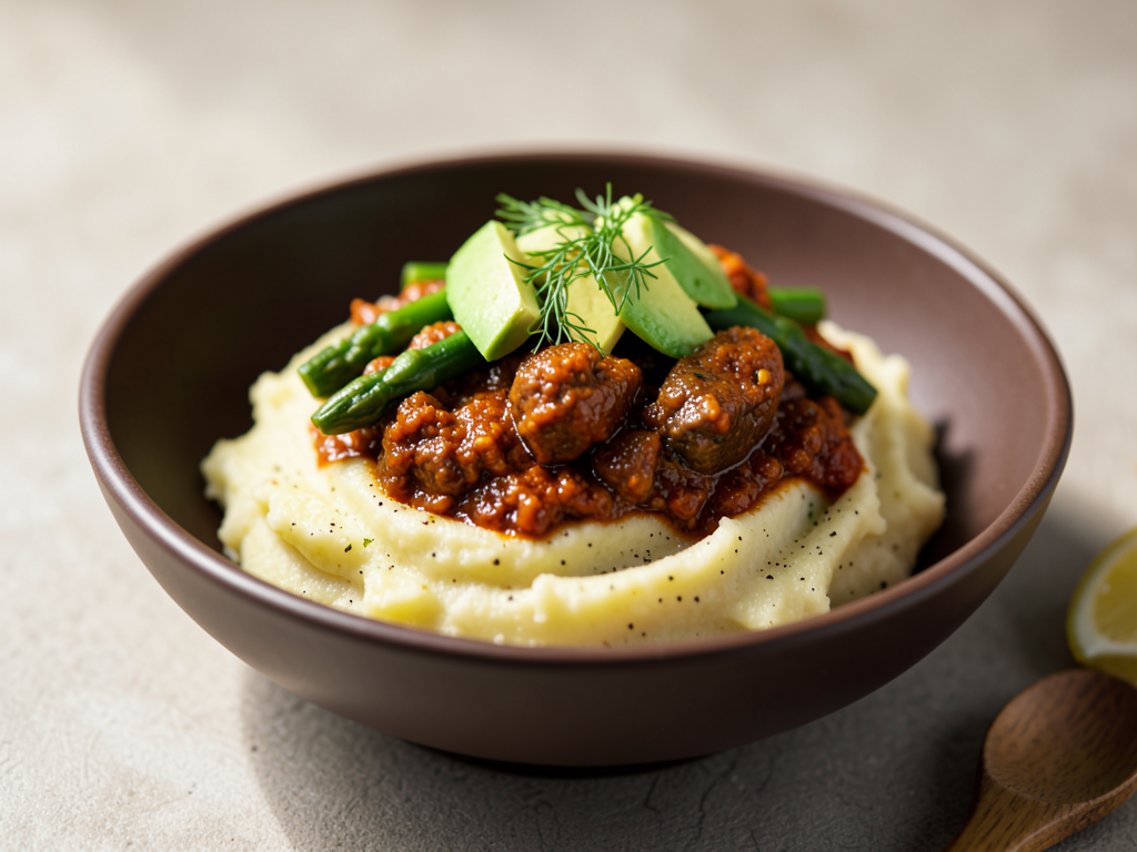 - Spoon the harissa beef and vegetable mixture over the mashed potatoes. Top with diced avocado and garnish with fresh dill.