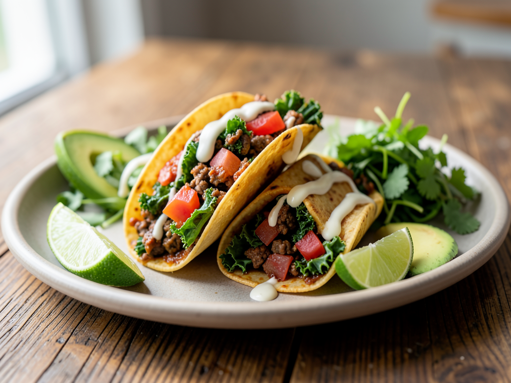 - To assemble the tacos, spoon the beef and kale mixture onto each tortilla, then fold them in half.
