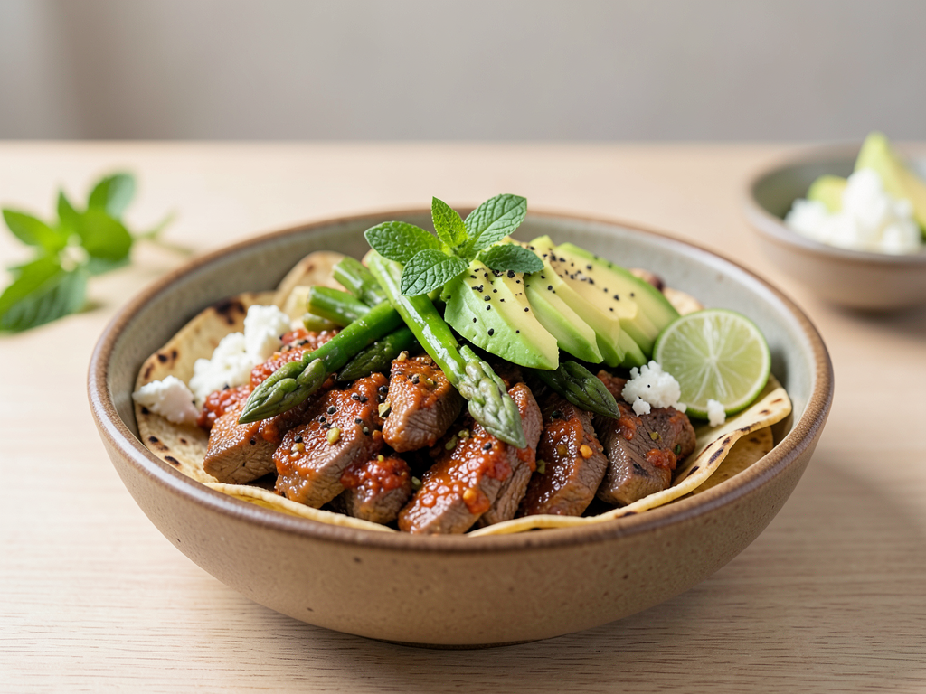 Welcome to the vibrant world of the Harissa Beef Tortillas Bowl! This colorful dish brings together tender beef tossed in spicy harissa, accompanied by fresh tortillas, crunchy asparagus, and creamy avocado. The fresh mint adds a delightful aroma, while a sprinkle of cracked black pepper elevates the flavors. Feel free to customize the bowl with your favorite veggies or spices—cooking should always be an adventure!