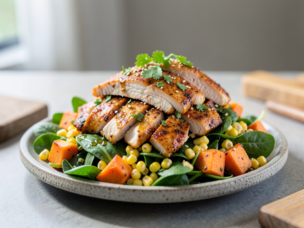- In a large serving bowl, layer the baby spinach, roasted pumpkin, and sweet corn.