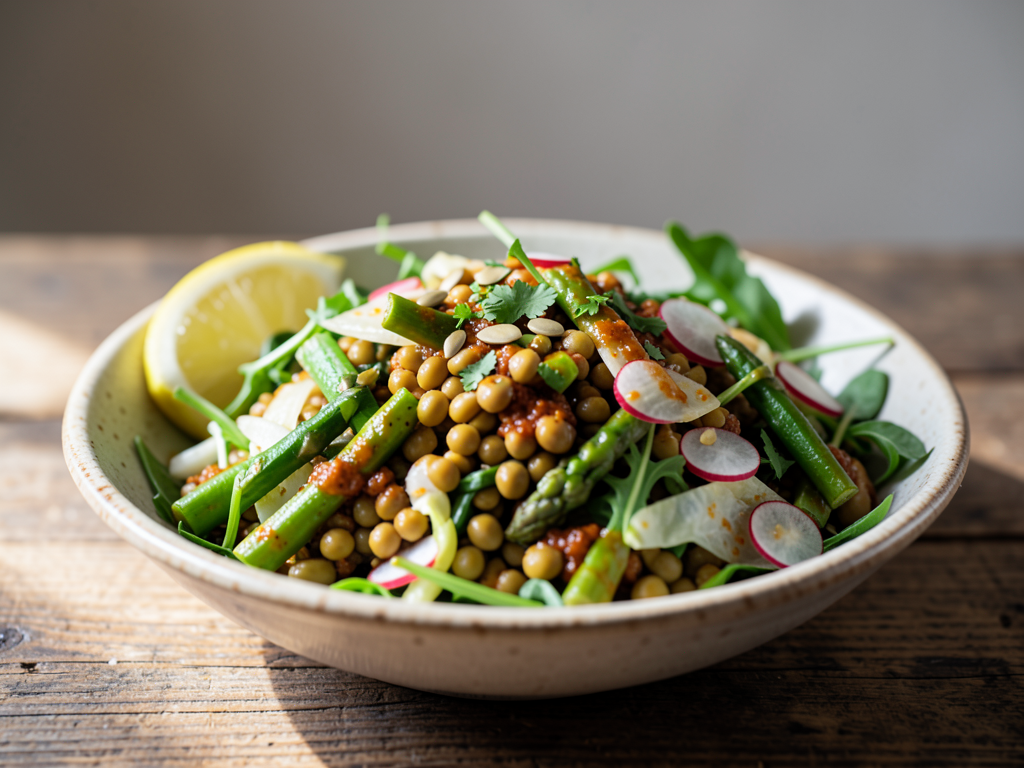 - In a large mixing bowl, combine the sliced cabbage, asparagus pieces, and mixed salad greens. Drizzle half of the harissa dressing over the salad and toss gently to coat.