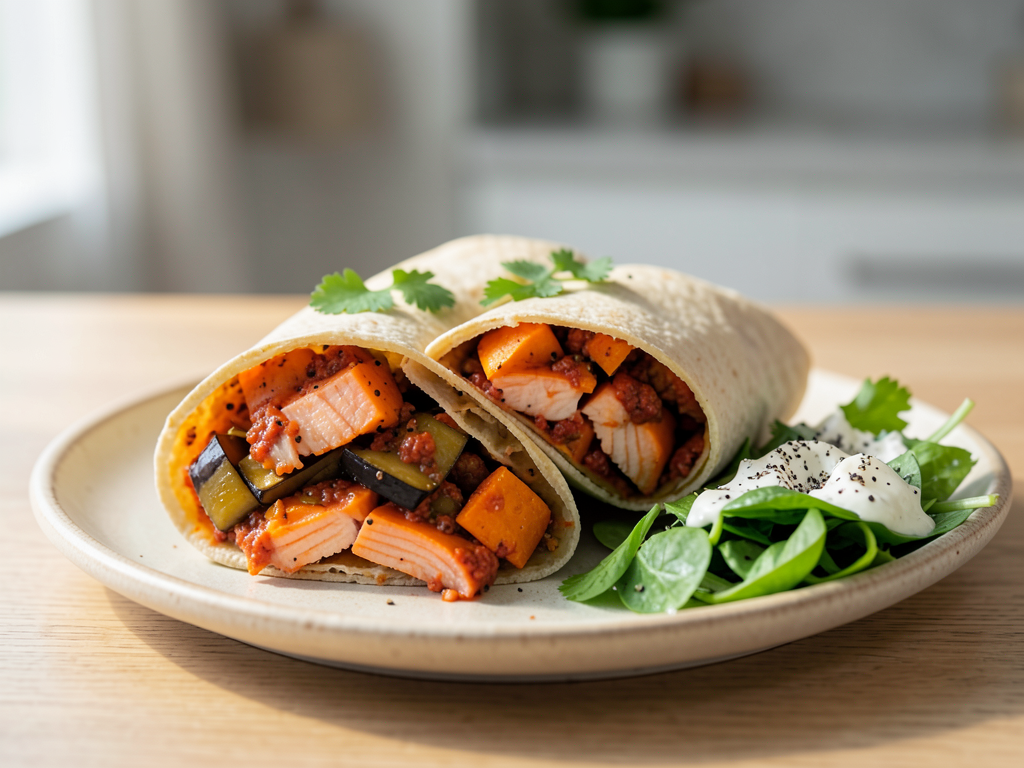 Indulge in this delightful Harissa Salmon Wrap filled with a warm combination of salmon, pumpkin, and eggplant. Each bite is complemented by the spicy kick of harissa sauce, making it both delicious and nutritious. Cut in half and served alongside a simple side salad topped with cracked black pepper, this dish is perfect for a quick and healthy meal. Feel free to play around with the vegetables or add your favorite toppings to make it uniquely yours!