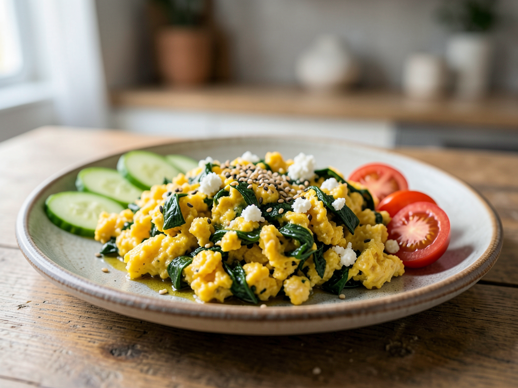 - Serve the scramble hot, garnished with sesame seeds, alongside fresh cucumber slices or cherry tomatoes.