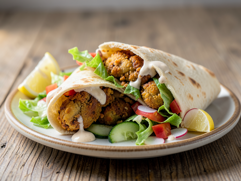 - Once the falafel is cooked, place them inside the pita breads, add the fresh salad, and drizzle with tahini sauce if desired. Serve with lemon wedges on the side.