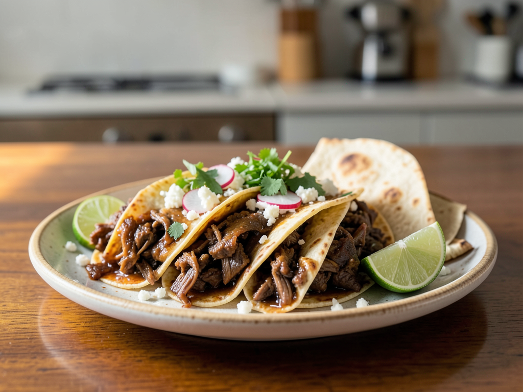 - Assemble the tacos by placing shredded beef onto each tortilla. Top with your choice of cilantro, radishes, and queso fresco. Serve with lime wedges on the side.