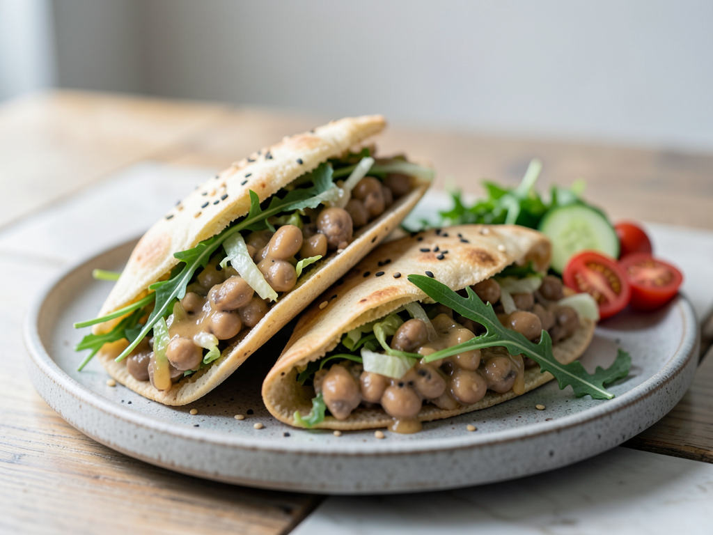 - Carefully open each pita and fill them with the kidney bean and arugula mixture generously.