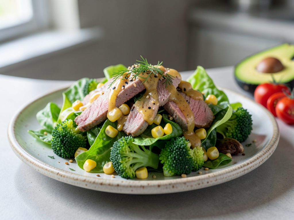 Honey Mustard Lamb Salad with Corn and Broccoli