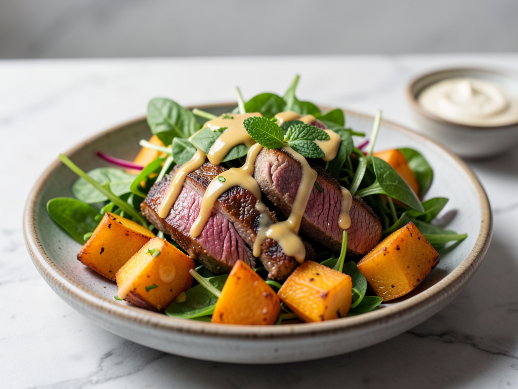 Honey Mustard Lamb Salad with Spinach and Pumpkin