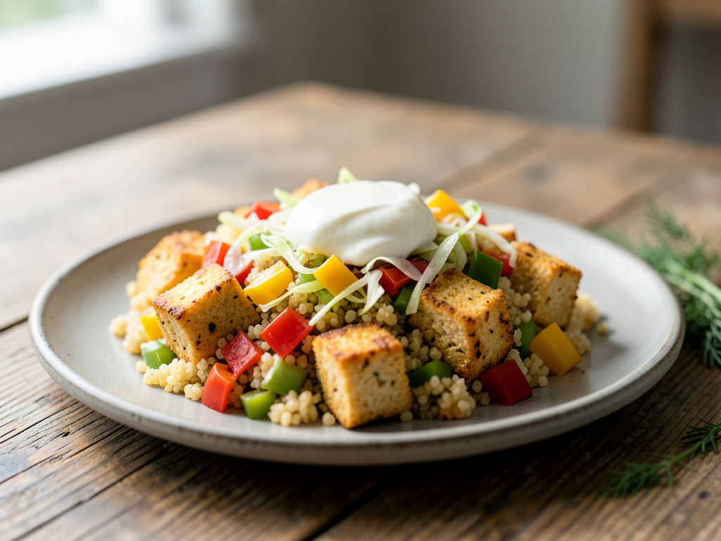 - Fluff the couscous with a fork and fold it gently into the tofu and vegetable mix.