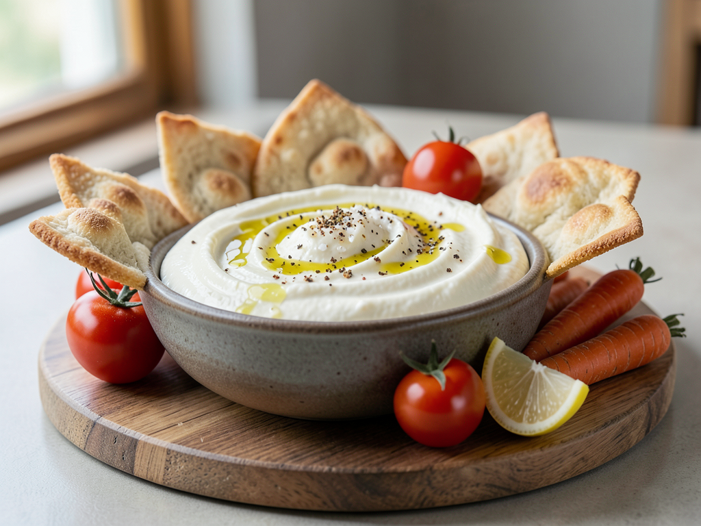 - Serve the warm pita wedges alongside the labneh and veggie sticks for dipping. Enjoy!