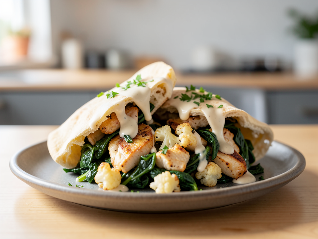 Experience a delightful blend of flavors with our warm Lemon Herb Chicken Stuffed Pita! This dish features tender chicken, vibrant spinach, and nutritious cauliflower, all enveloped in a zesty lemon herb sauce. It’s perfect for a quick meal or casual dining. Feel free to customize your stuffed pita with your favorite herbs or even substitute different veggies to suit your taste.