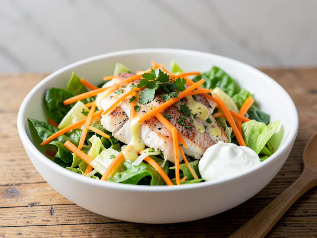 Dive into a refreshing bowl of our Lemon Herb Cod Salad featuring crisp romaine, vibrant carrots, and crunchy cabbage. This delightful salad is topped with tender cod fillets, all dressed in a zesty lemon-herb sauce. Finish it off with a sprinkle of fresh parsley and a dollop of creamy yogurt on the side. This recipe is versatile, so feel free to mix and match your favorite veggies or adjust the dressing to your taste!