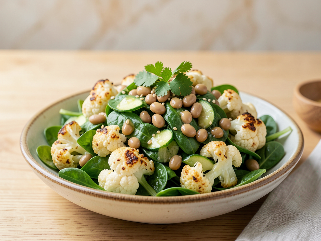 - In a large mixing bowl, combine the baby spinach, cooled cauliflower, zucchini, and kidney beans.