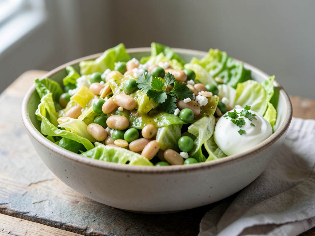 - In a large mixing bowl, combine the chopped romaine, green peas, and sliced cabbage. Toss them gently to mix.