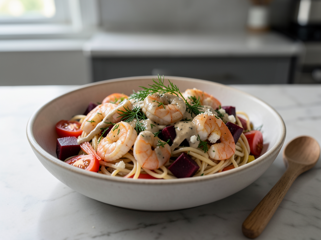 - In a large mixing bowl, combine the cooked noodles, halved cherry tomatoes, diced beets, and chopped dill.