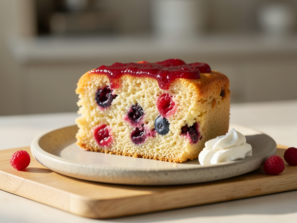 - Once cool, spread your choice of fruit jam over the top. Slice and serve, garnished with fresh berries and whipped cream if desired.