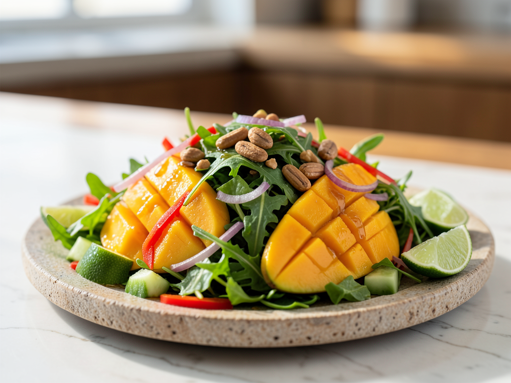 - In a large mixing bowl, combine the sliced mango, mixed salad greens, red bell pepper, cucumber, and red onion. Toss gently to avoid bruising the mango.