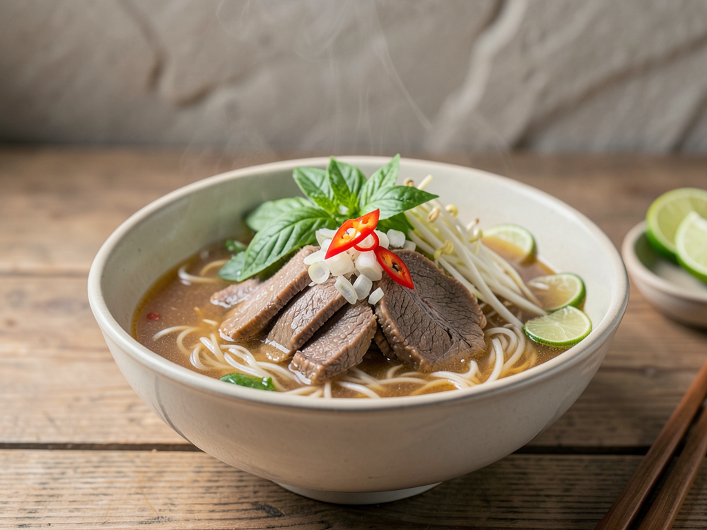 - Serve immediately with fresh herbs, bean sprouts, lime wedges, chili slices, and chopped spring onions on the side.