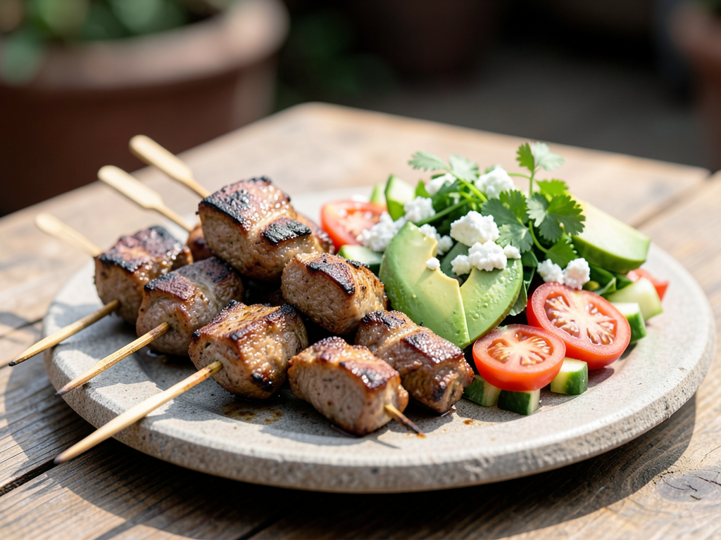 8. Serve the skewers on a plate accompanied by the fresh salad and sprinkle with feta cheese if desired.