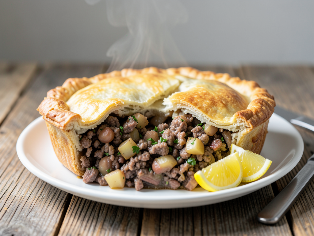 Light Quebec City Tourtiere Style Pie with Lemon Wedges